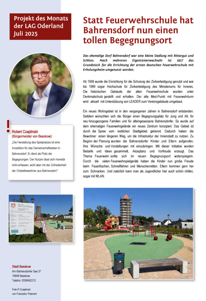 Der Begegnungsplatz in Bahrensdorf ist Projekt des Monats Juli 2025. Im neuen Wohngebiet wurden Eltern, Kinder und Jugendliche gefragt, was sie sich für den neuen zentralen Platz wünschen. Sehen Sie im Anhang bitte selbst, wie sich die Mitte von Bahrensdorf zum zentralen Platz der Begegnung gemausert hat.